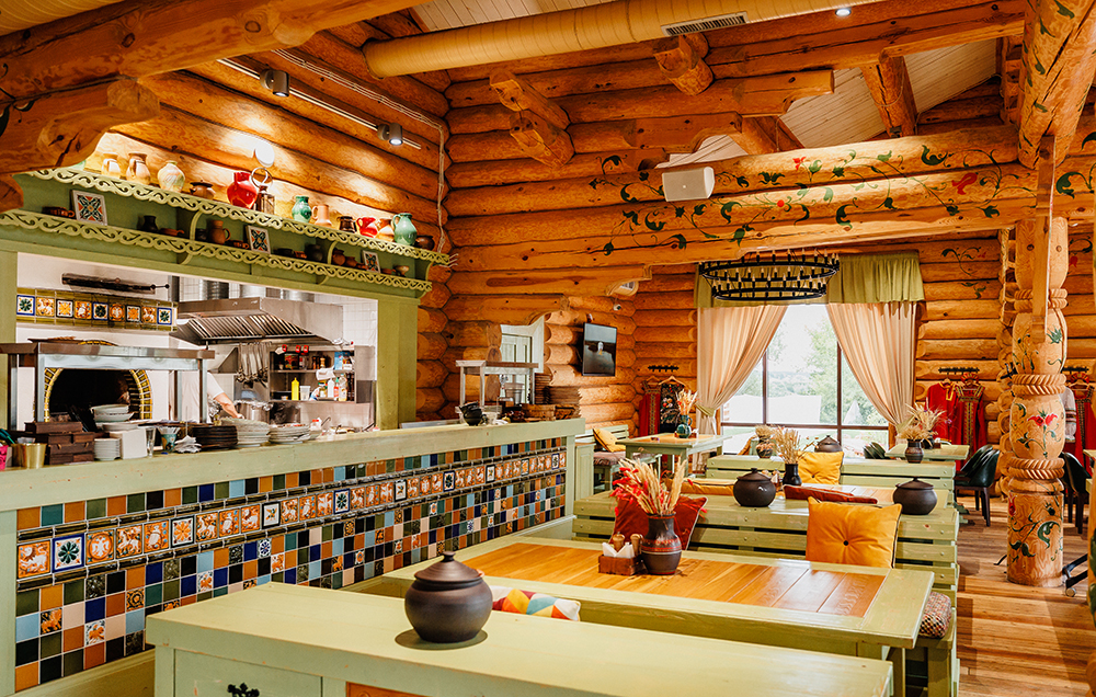 Уютная обстановка ресторана оформлена глиняной посудой и деревянной мебелью, а панорамные окна открывают вид на природные красоты живописной местности.